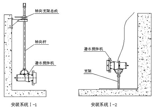 當池深H<4米時建議采用安裝系統一。潛水攪拌機的潛水深度可以根據需要進行垂直方向的調節,而且在水平賣弄內可繞導桿旋轉的角度為正負60°起吊系統底座、支撐架和下托架與池的有關連接面均采用膨脹螺栓固定,無需預留孔。安裝系統二用導向鋼繩替代導桿,具有運輸方便,現場安裝簡單等特點。該系統從根本避免了由于運輸引起導桿彎曲的、變形從而影響正常使用的情況,并有效改善了池深過深情況下,由于導桿的安裝誤差而導致的無法正常起吊等現象。在有懸臂池頂的安裝條件下更顯得操作方便可靠。